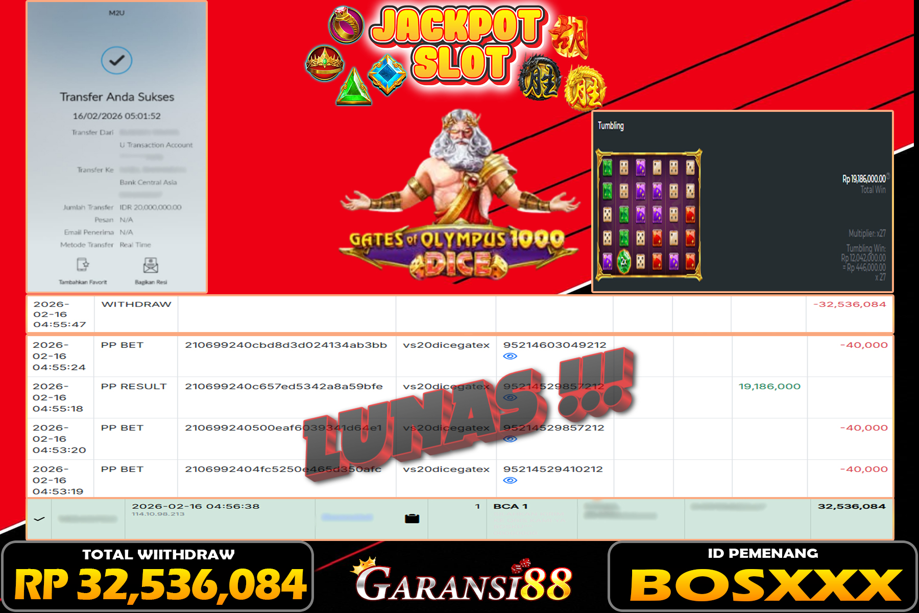 JACKPOT GATES OF OLYMPUS 1000 DICE 16 FEBRUARI 2026