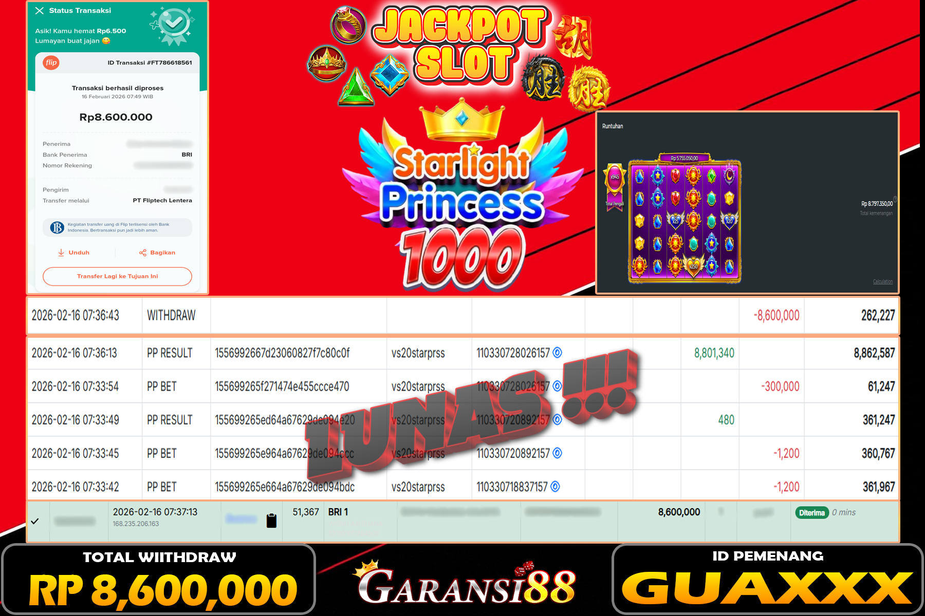 JACKPOT STARLIGHT PRINCESS 1000 16 FEBRUARI 2026