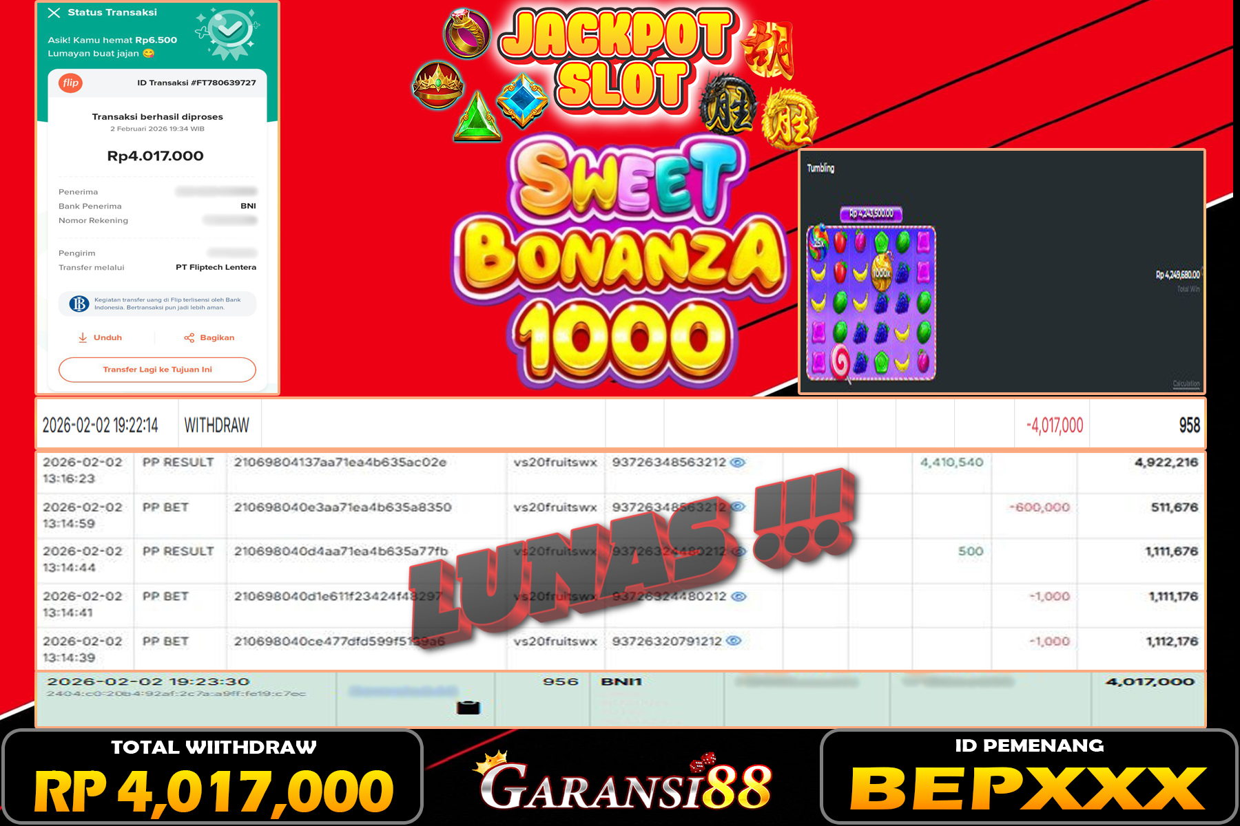 JACKPOT SWEET BONANZA 1000 2 FEBRUARI 2026